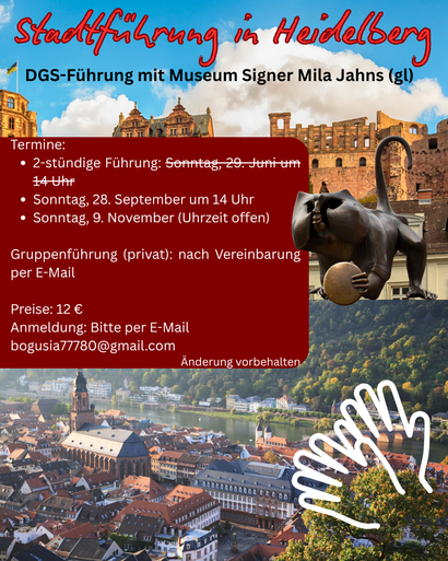 Falls Sie Fragen zu gebärdensprachige Stadt- und Museumsführungen bzw. die Daten aktualisieren möchten, melden Sie sich einfach bei Angela Benschuh a.benschuh@netgest.de